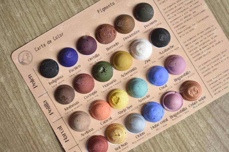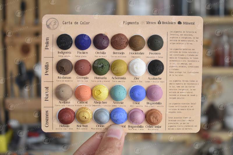 Los pigmentos de Tortolita mi Inventiva, son naturales orgánicos e inorgánicos, se han extraído de manera natural, de origen botánico, térreo y mineral.