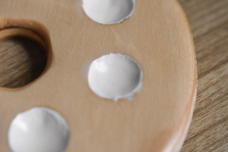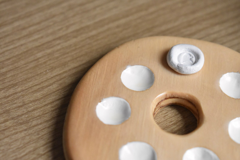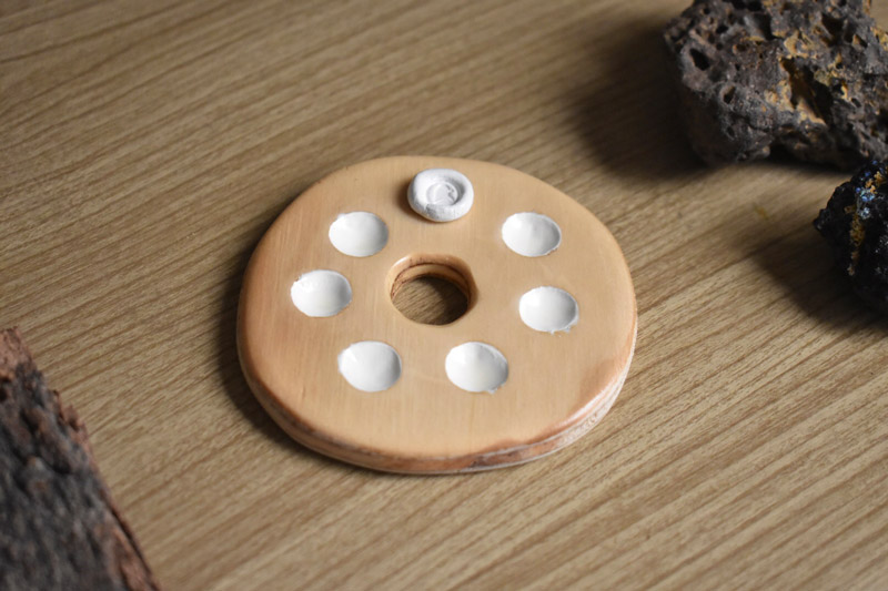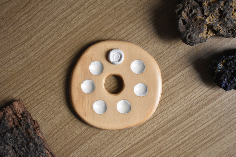 Esta paletita en forma de redonda y de dona, tiene una perforación para que las puedas manipular en tu mano o para que la puedas colgar, esta cortada a mano,, tiene 6 estanques, con capacidad de 7 a 10 gotas de agua.