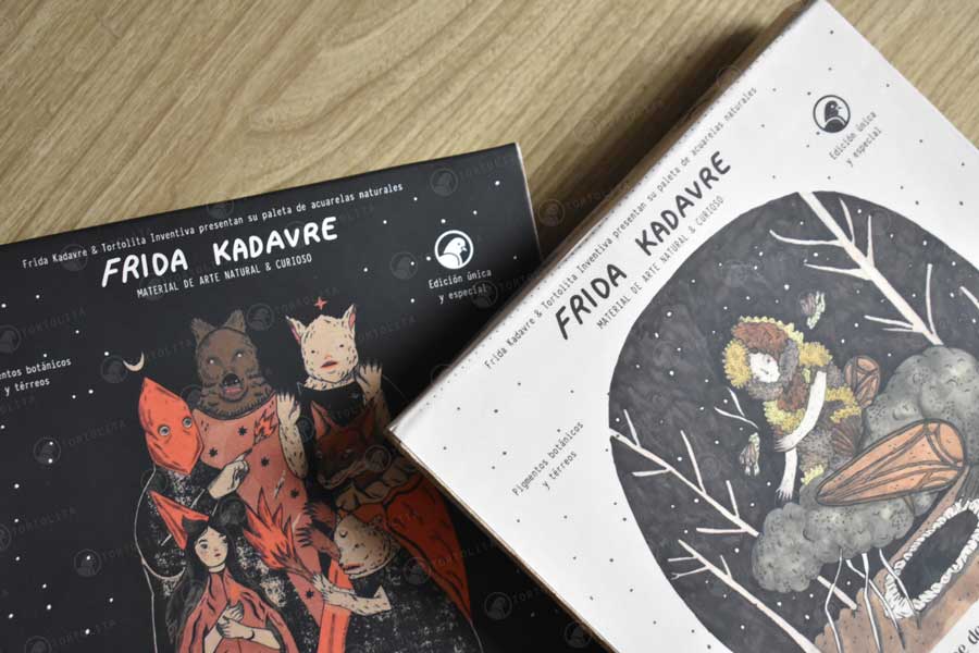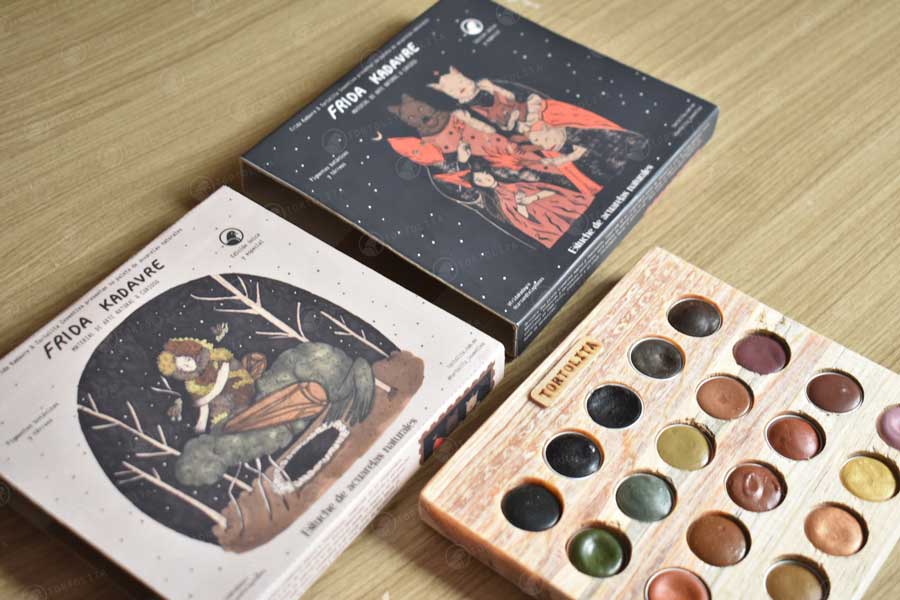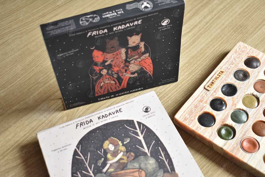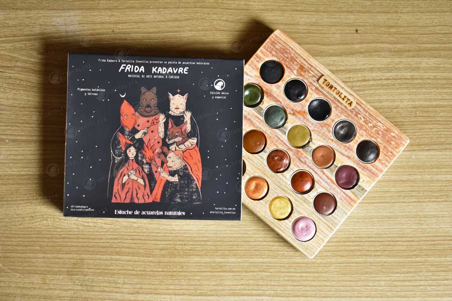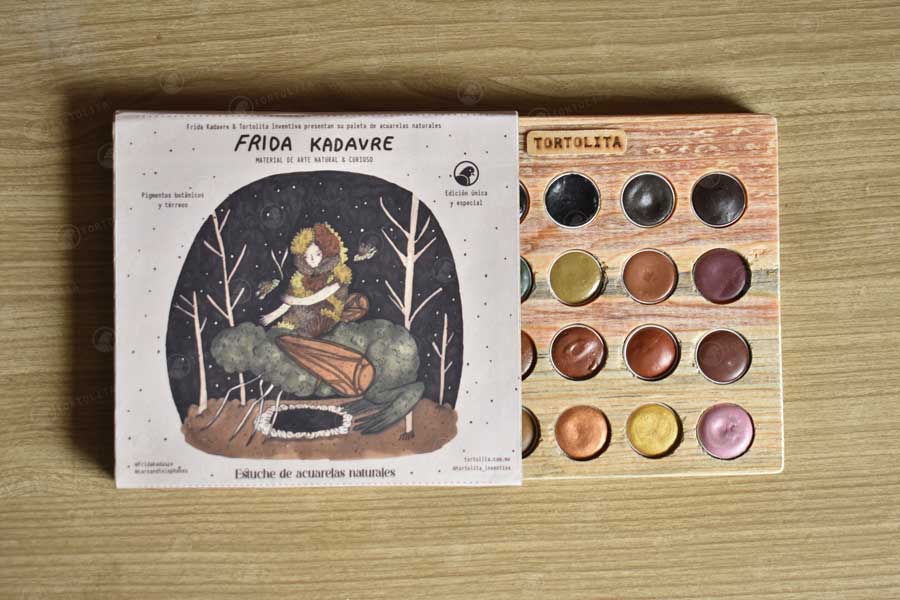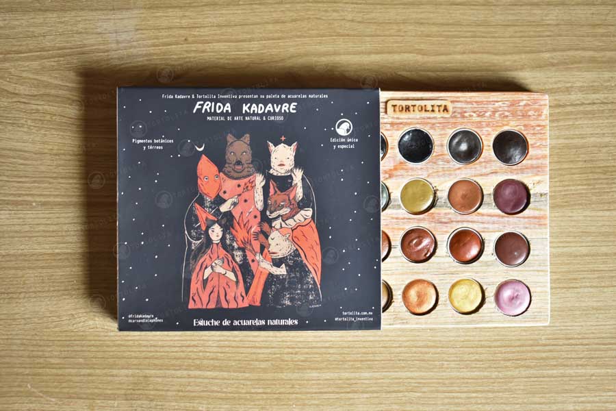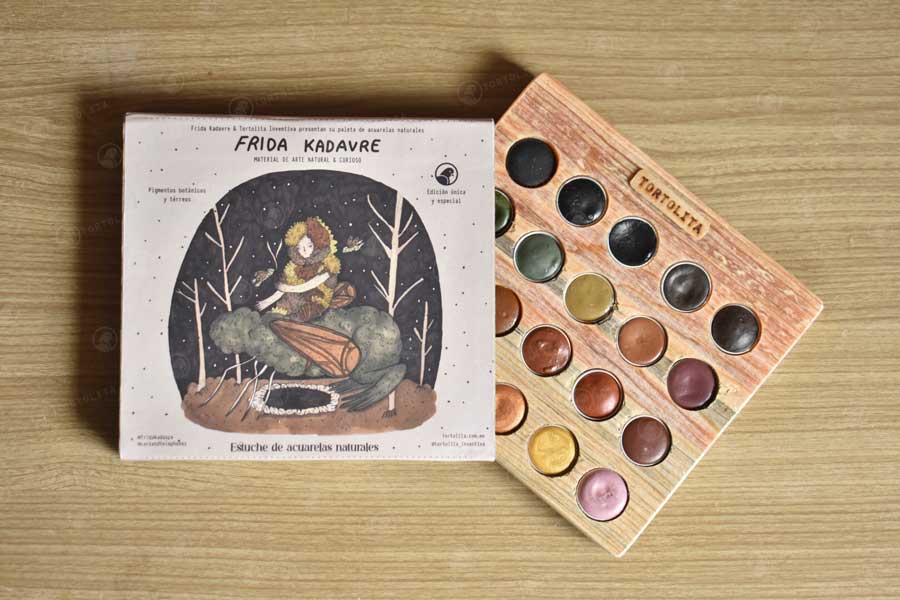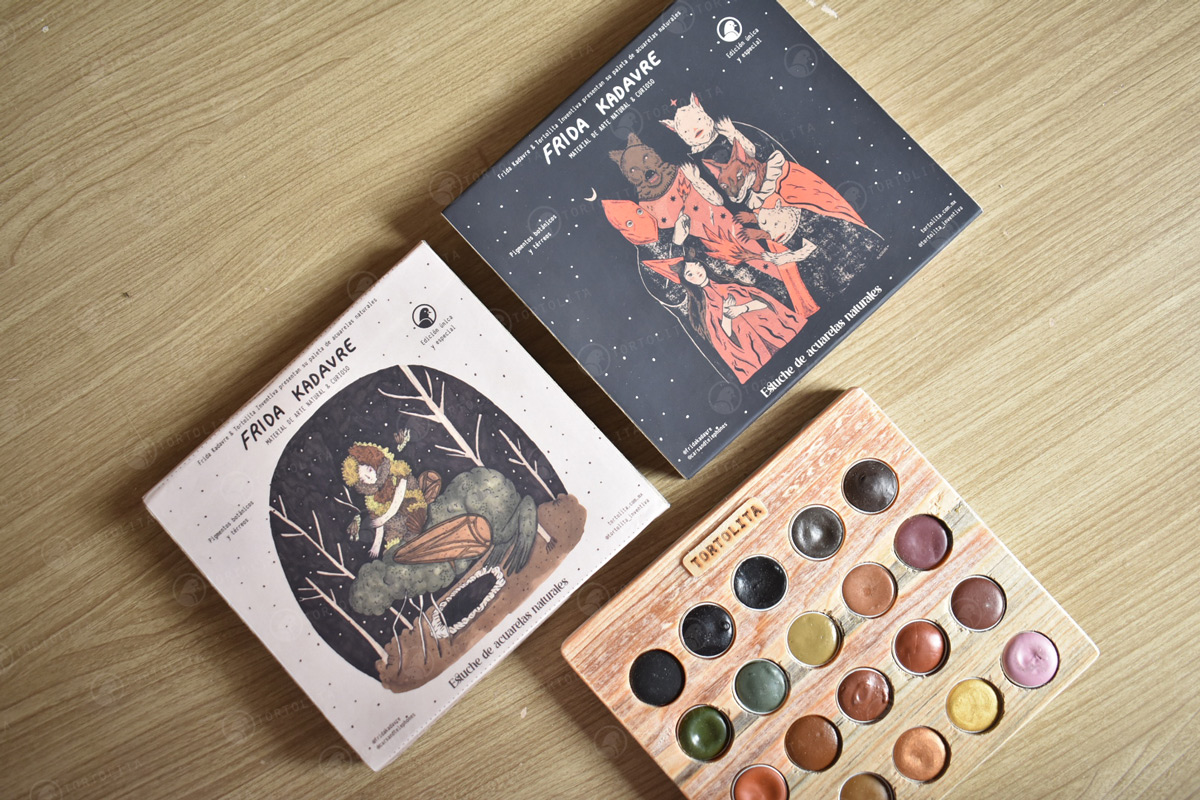 Los colores fueron elegidos por la ilustradora Frida e hizo una selección de diferentes colores disponibles de nuestras paletas de acuarelas y se incluyeron como primicia 8 nuevos colores de pigmentos tierra.