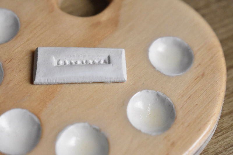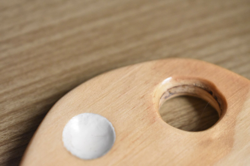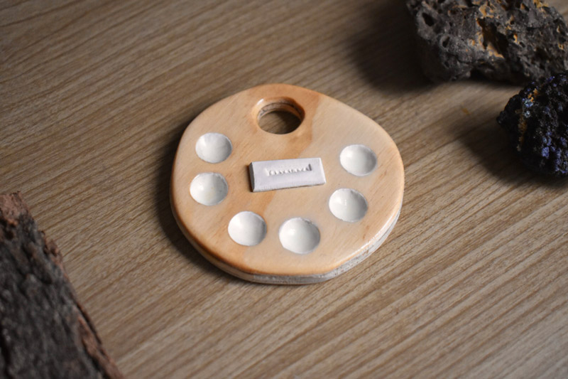 Esta paletita en forma de redonda tiene una perforación para que las puedas manipular en tu mano o para que la puedas colgar, esta cortada a mano, tiene 6 estanques, 2 con capacidad de 7 a 10 gotas de agua.