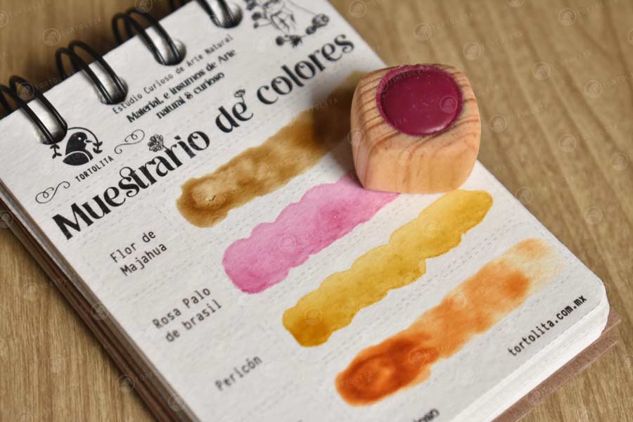 Acuarela natural de pigmento Laca botánico de Palo de Brasil, de color rosa, el contendedor es tallado a mano en madera de pino recuperada, cubierta de aceite de olivo.